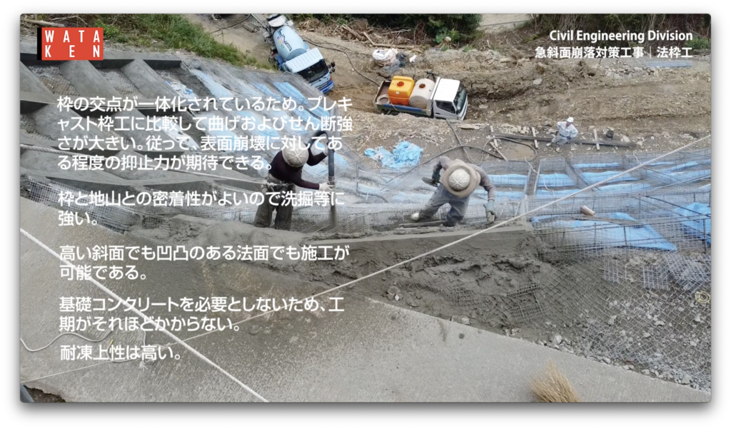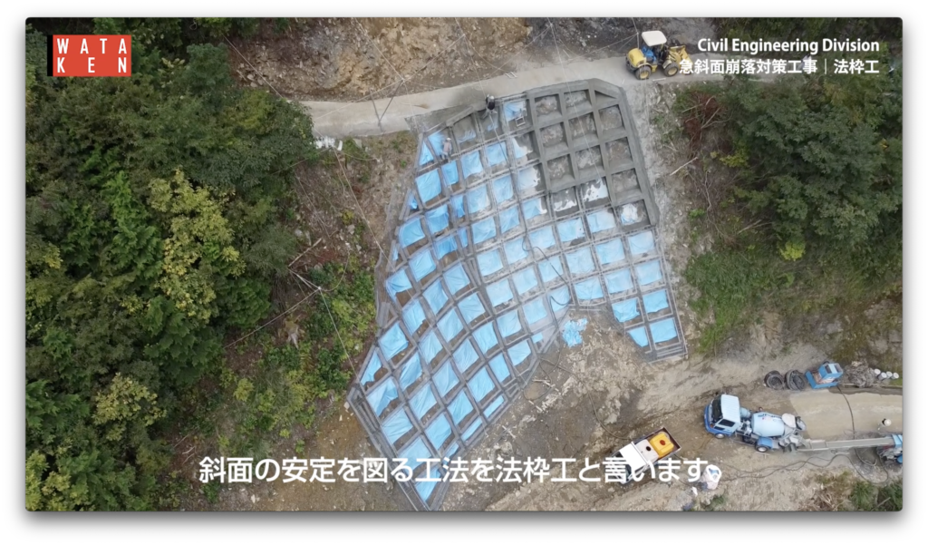 斜面崩落対策工事|法枠工 2023 11/02 斜面崩落防止工事 斜面上に格子状のモルタルやコンクリートを造成して、斜面の安定を図る工法を法枠工と言います。法面の浸食や風化を防止し、崩落を防ぐことを目的としています。 斜面崩落防止工事 動画 よかったらシェアしてね! 林道開設工事(富郷町津根山)